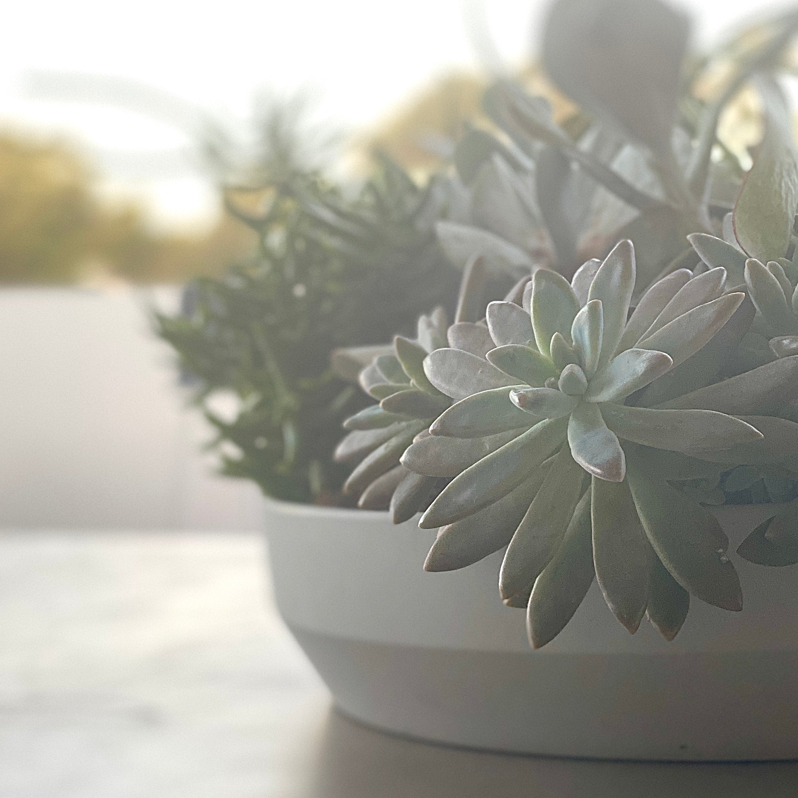 Sitting in a shallow grey West Elm melamine bowl, this piece is sleek and modern. Silvers, whites and a plethora of greens make this contemporary piece fit with any decor style. Perfect to withstand the elements outside, or in a sunny spot inside, this piece is stylish and very on trend.