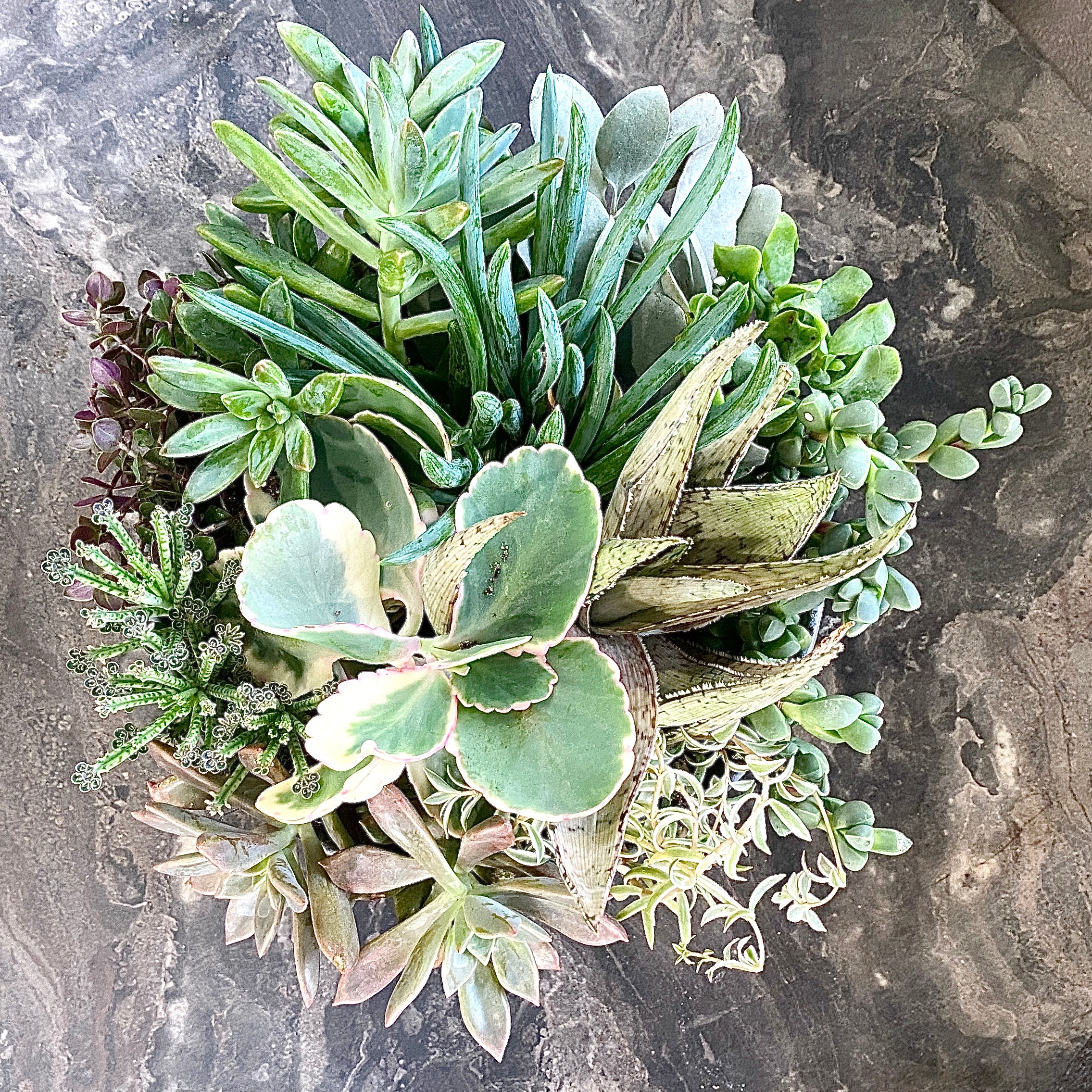 Made with a range of succulents that throw blue, grey and pale greens to complement the bowl, however this piece can be made custom to order with your preference in greenery - just get in touch and we will do our best to make it happen.