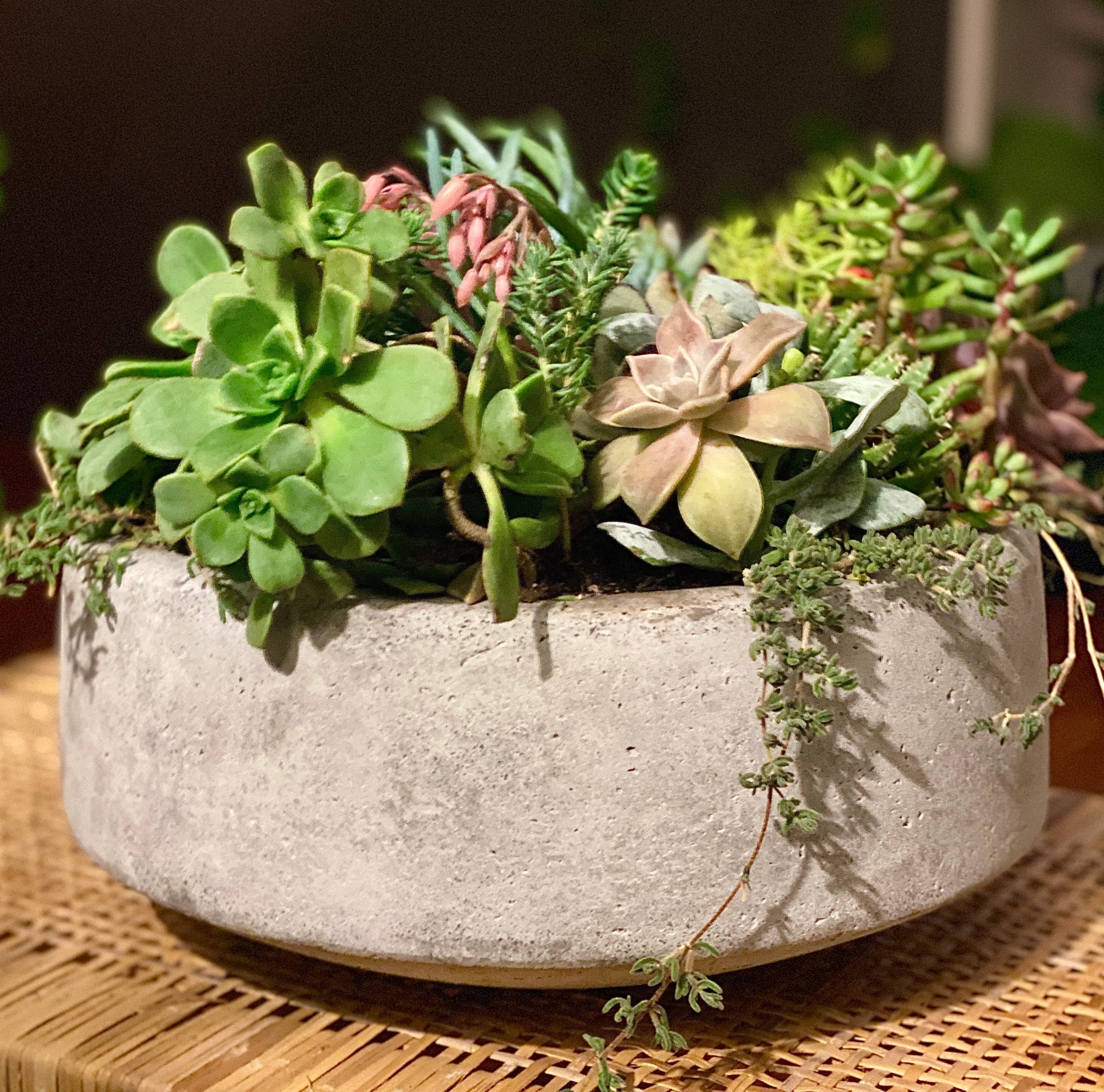A larger, charcoal planter measuring 34cm in diameter. This planter is tapered at the base, creating a sleek look that will be best seen by placing on a table or on any other raised setting. Paired with stunning greenery completely filling this bowl, with cascading succulents and other varieties on all sides.