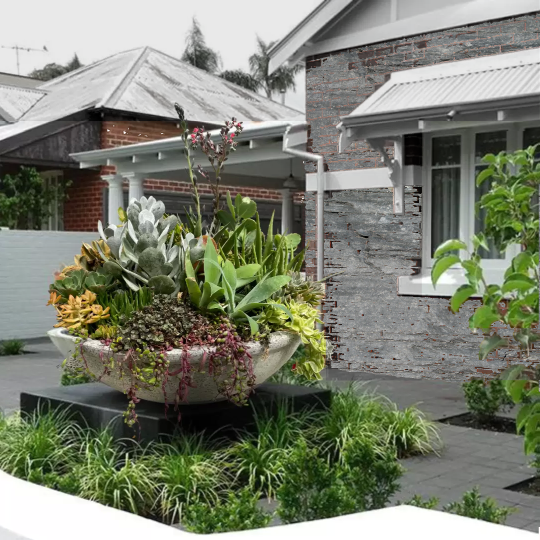 An extra large, charcoal terrazzo planter measuring a whopping 85cm in diameter. Paired with stunning greenery completely filling this bowl, with cascading succulents and other varieties on all sides. As its name suggests, this piece certainly makes a statement, whether it be in your front garden, or back. Incorporate the bowl into your front landscaping by seeting it by a retaining wall or angled wall - this provides a more seamless integration with your currenty landscaping.