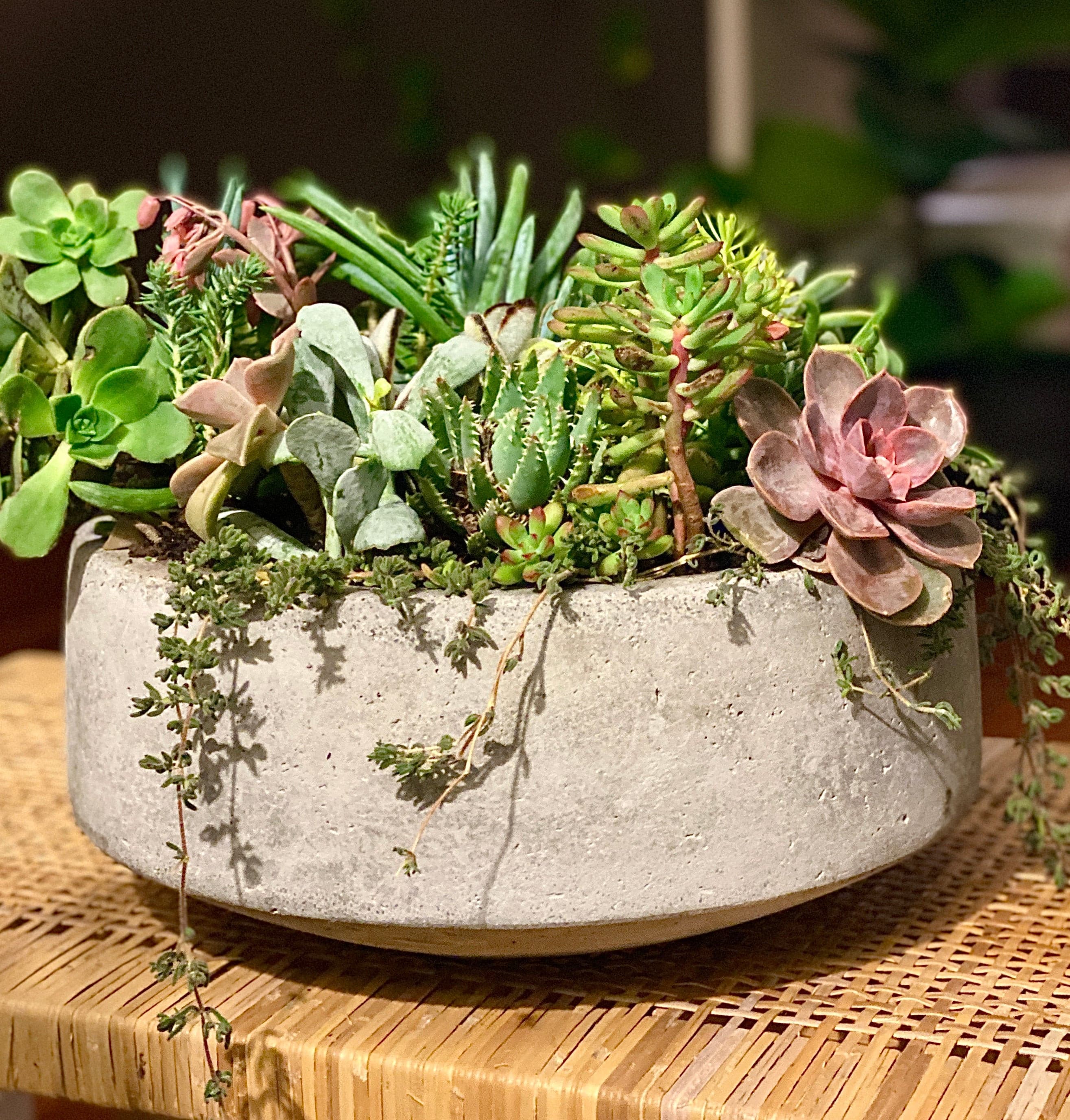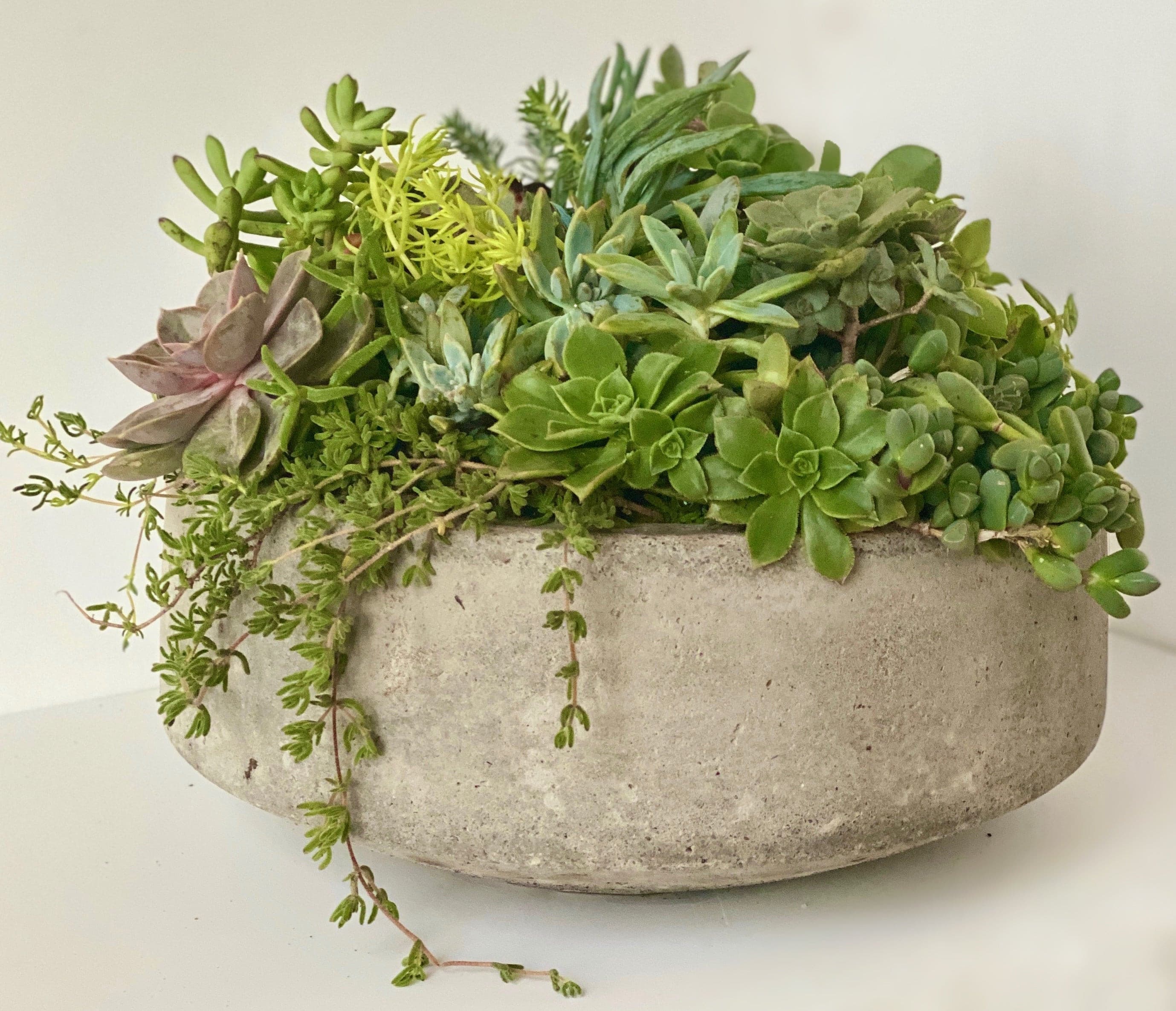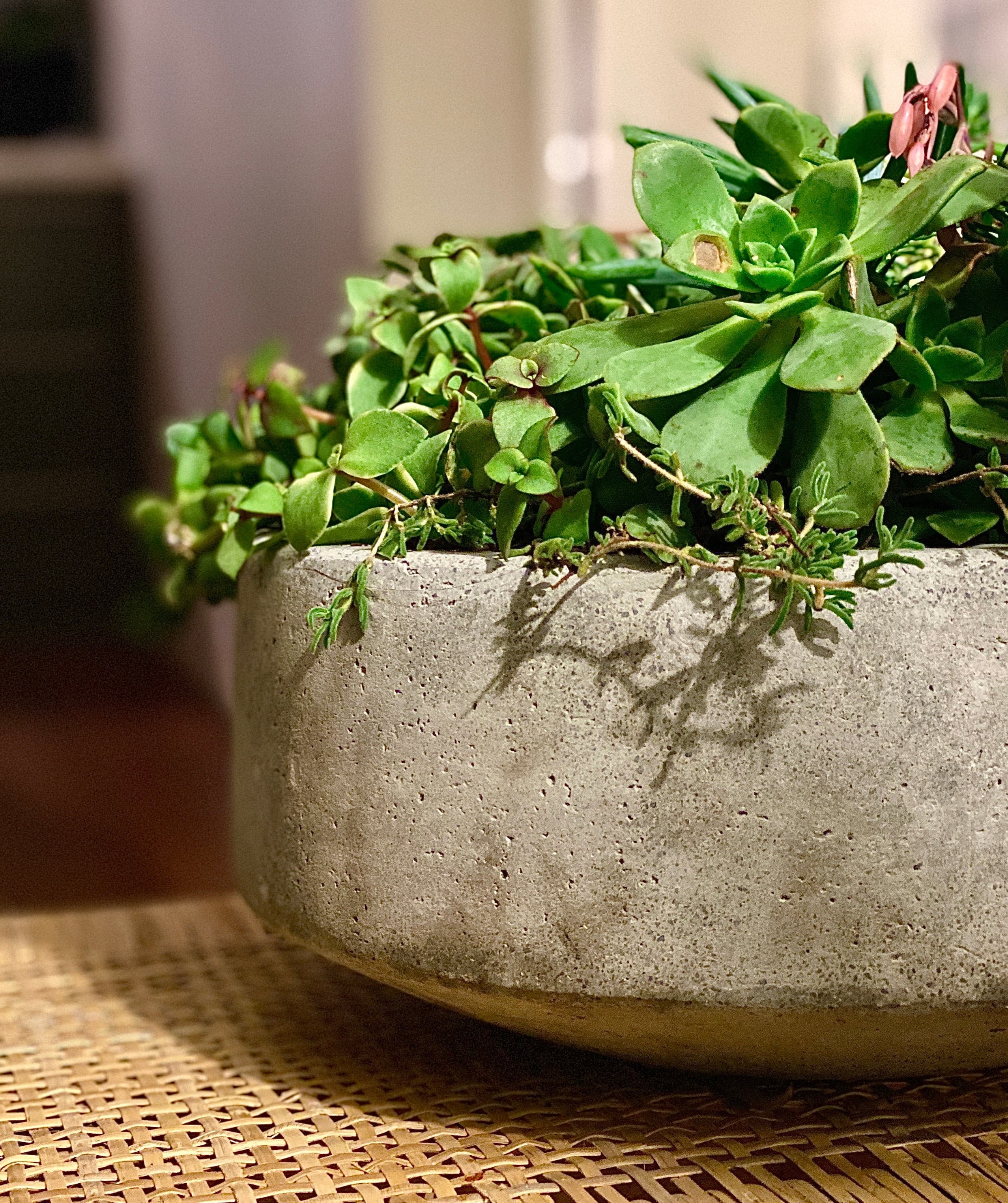 A larger, charcoal planter measuring 34cm in diameter. This planter is tapered at the base, creating a sleek look that will be best seen by placing on a table or on any other raised setting. Paired with stunning greenery completely filling this bowl, with cascading succulents and other varieties on all sides.