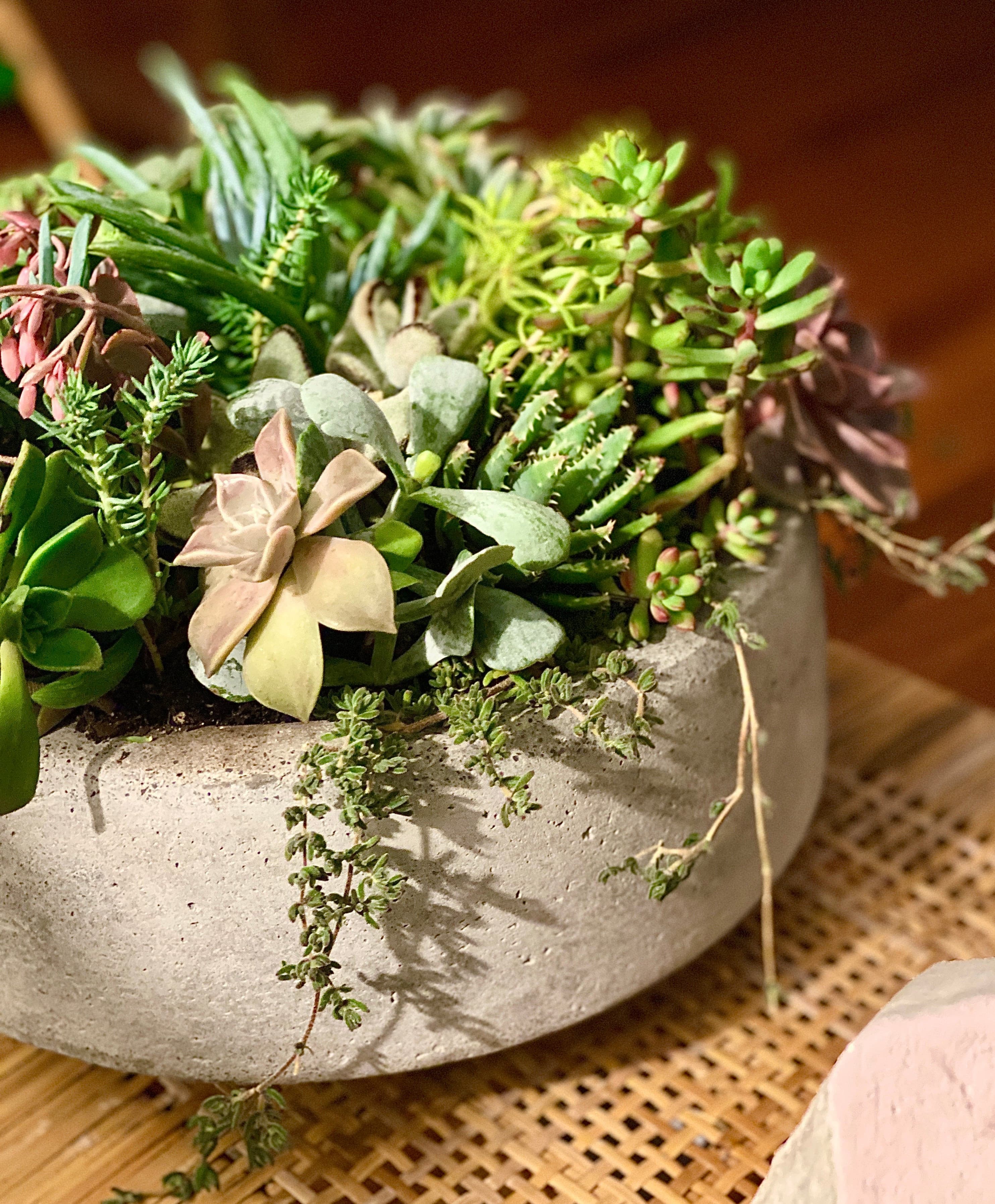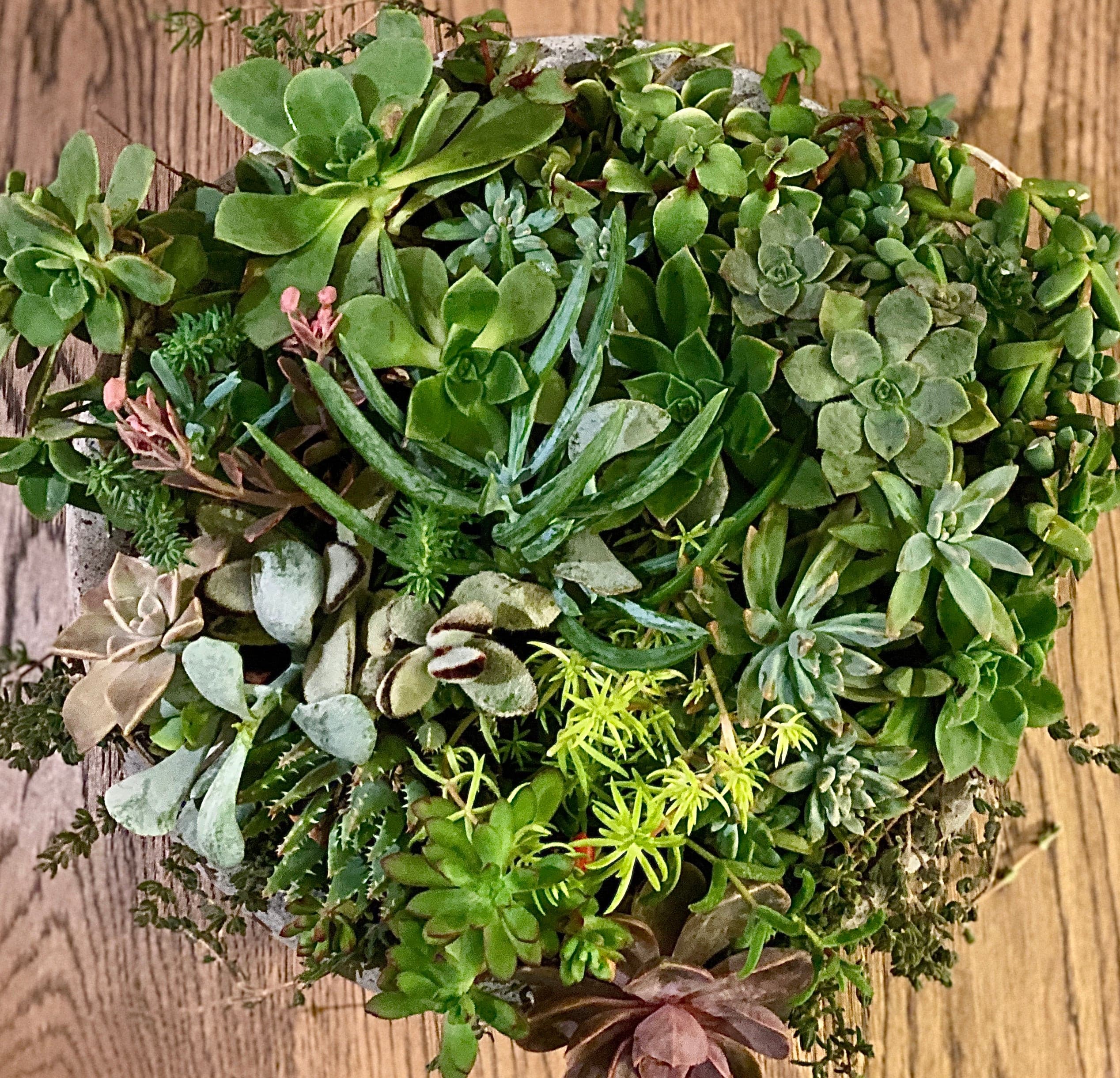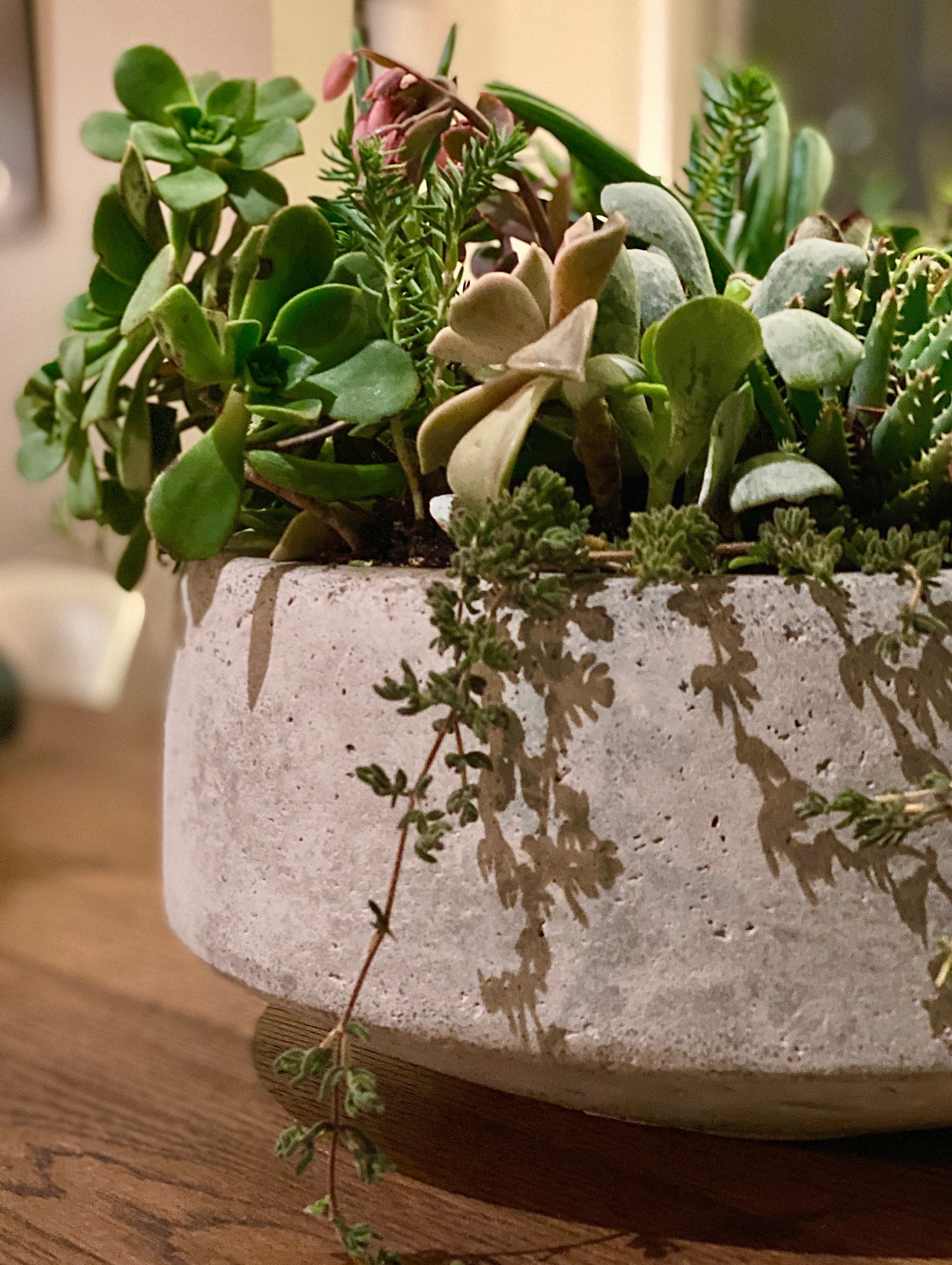 A larger, charcoal planter measuring 34cm in diameter. This planter is tapered at the base, creating a sleek look that will be best seen by placing on a table or on any other raised setting. Paired with stunning greenery completely filling this bowl, with cascading succulents and other varieties on all sides.